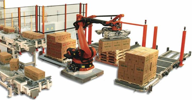 机器人码垛机是在引进德国技术的基础上自行开发制造的,它在啤酒、饮料、食品行业包装中用于堆彻各种交错排列的箱垛,其包装材质可以是纸箱、塑料箱、托盘、热收缩膜等。分高、低位码垛两种形式,采用那种型式视啤酒、饮料厂家车间具体情况而定,适用于30,000~40,000 瓶/时生产线需求。